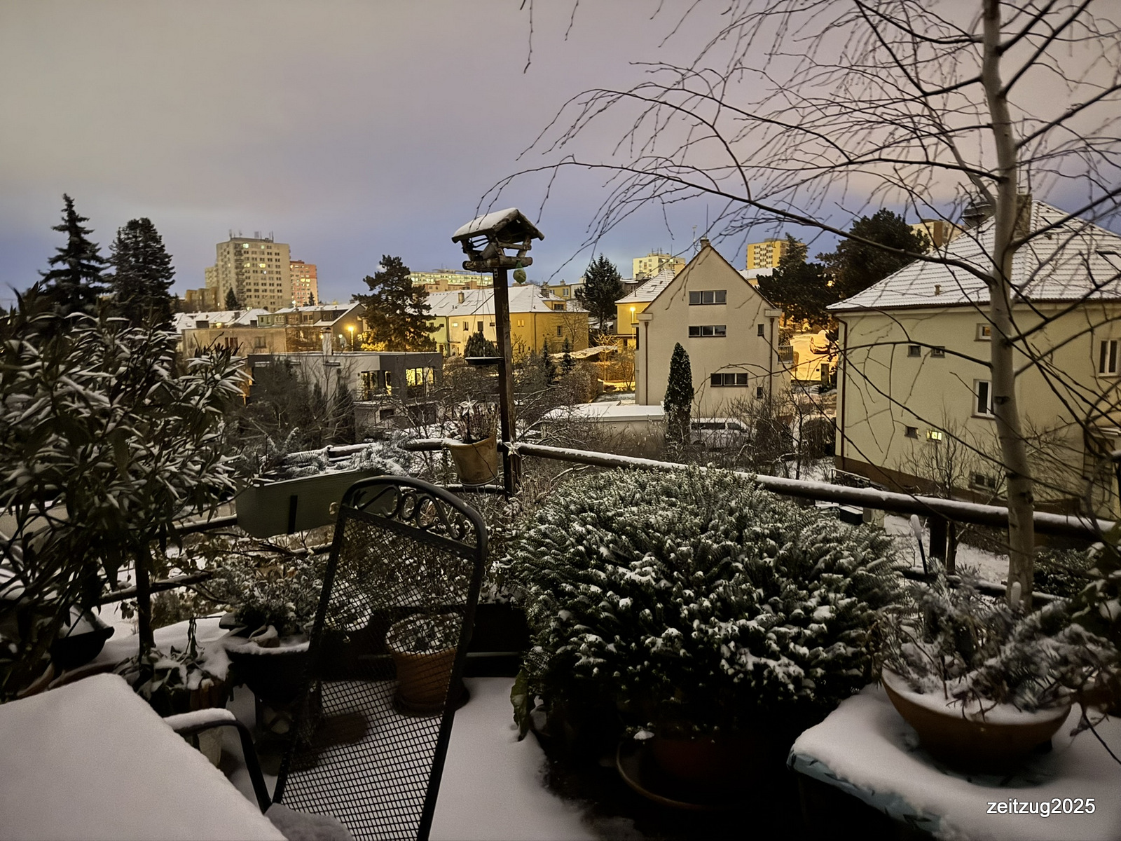 Bevor die Touristen die Innenstadt bevölkern mit der 22er Straßenbahn zurück in die Gartenstadt. Linsensuppe die erste Mahlzeit im neuen Jahr. Vorbei am Haus, einst war es von Privatpersonen bewohnt. Jetzt ist in den drei Etagen ein Bestattungsinstitut eingezogen, in der letzten Etage wohnt ein betagter Freund. Wünsche ihm und allen ein gesundes 2025. Achtet auf Euch und Eure Umwelt. Abends auf dem Balkon der Prager Gartenstadt ein rot gefärbter Abendhimmel.