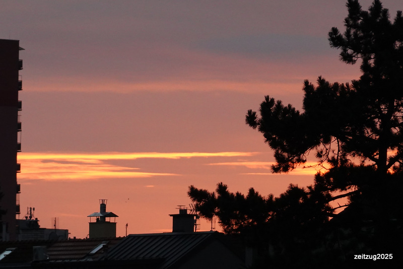 Bevor die Touristen die Innenstadt bevölkern mit der 22er Straßenbahn zurück in die Gartenstadt. Linsensuppe die erste Mahlzeit im neuen Jahr. Vorbei am Haus, einst war es von Privatpersonen bewohnt. Jetzt ist in den drei Etagen ein Bestattungsinstitut eingezogen, in der letzten Etage wohnt ein betagter Freund. Wünsche ihm und allen ein gesundes 2025. Achtet auf Euch und Eure Umwelt. Abends auf dem Balkon der Prager Gartenstadt ein rot gefärbter Abendhimmel.